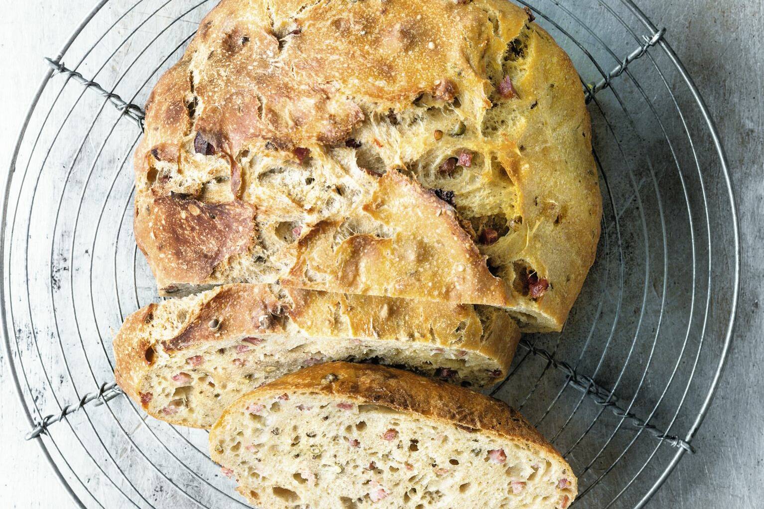 Brot mit speck backen. 650 g Mehl etwas Mehl 12 TL Trockenhefe brauner Zucker Salz 200 g geräucherter durchwachsener Speck 12 Bund Petersilie Frischhaltefolie. Die besten Speck Brot Rezepte - 25 Speck Brot Rezepte und viele weitere beliebte Kochrezepte finden Sie bei kochbarde. Dieses luftige und herzhafte Brot benötigt keine ausgefallenen oder aufwendigen Arbeitsschritte alles was ihr braucht ist ein wenig Zeit dann wandert der Teig über Nacht in den Kühlschrank und wird am nächsten Tag unkompliziert im heißen Topf gebacken.